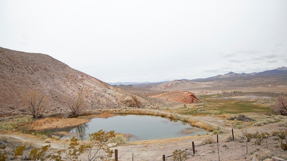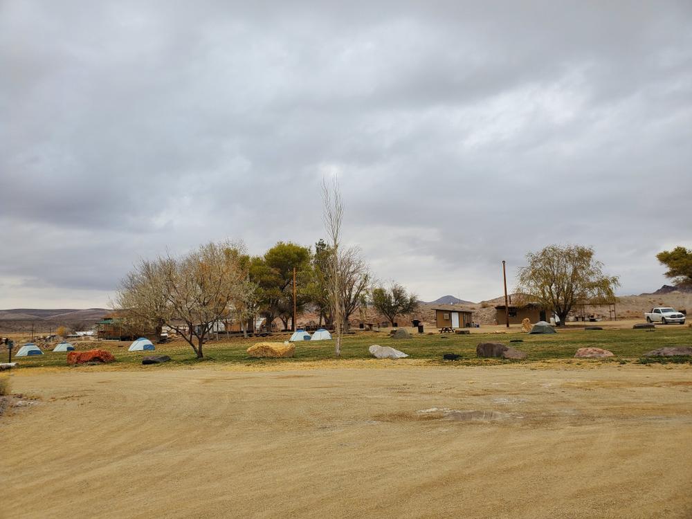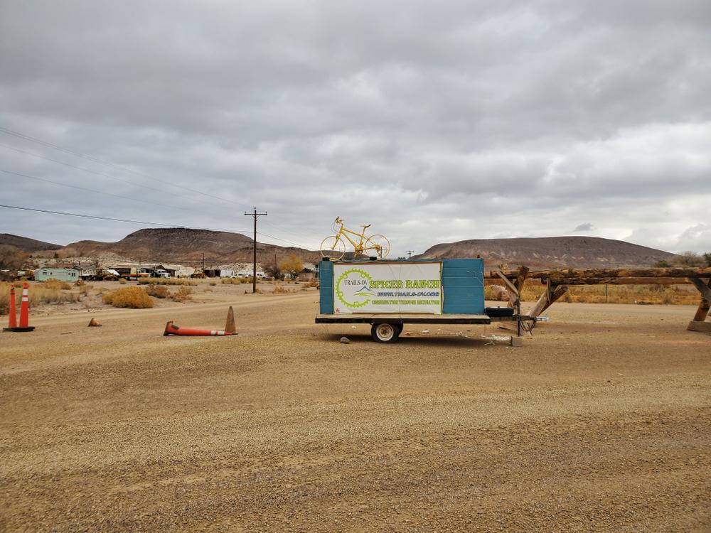 Spicer RanchThe trails are located just 10 minutes from downtown Beatty. To reach the trailhead, take US-95 north out of Beatty. Go 6.9 miles, and take a right onto Boiling Pot Road. The entrance for Spicer Ranch is marked by a bright yellow bicycle on top of the entrance gate. Continue along this dirt road until you see a fence lined with mountain bikes on top and keep right. Follow the fence line and signs for event area. This will take you to an open parking area about a half-mile from US-95, with a grassy campsite area, picnic tables, and bathrooms.